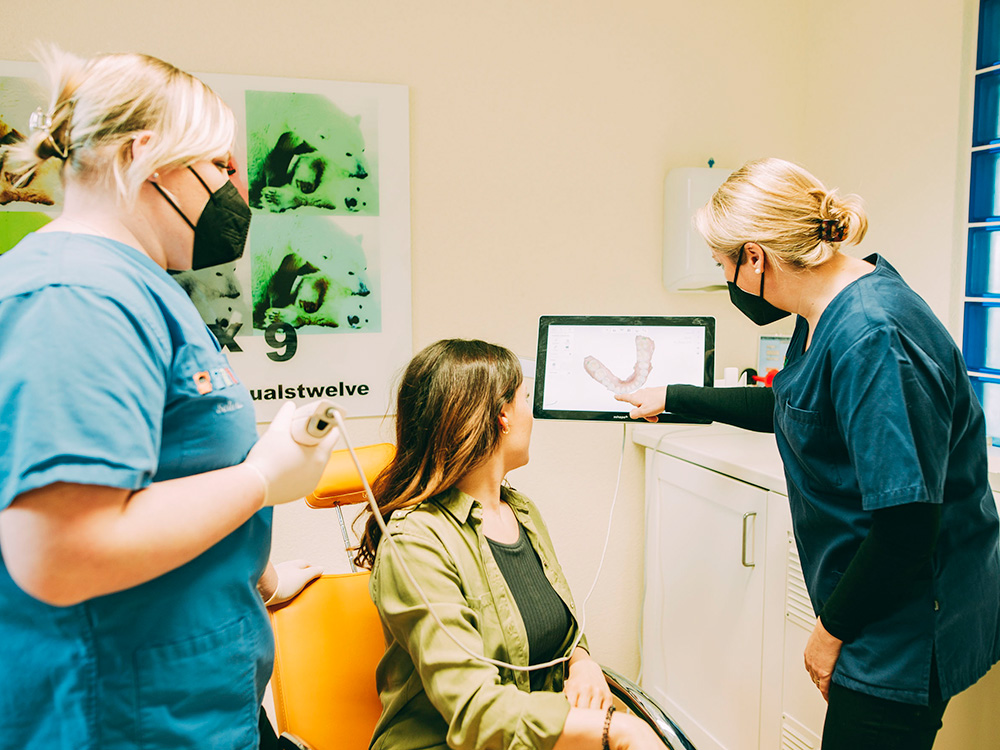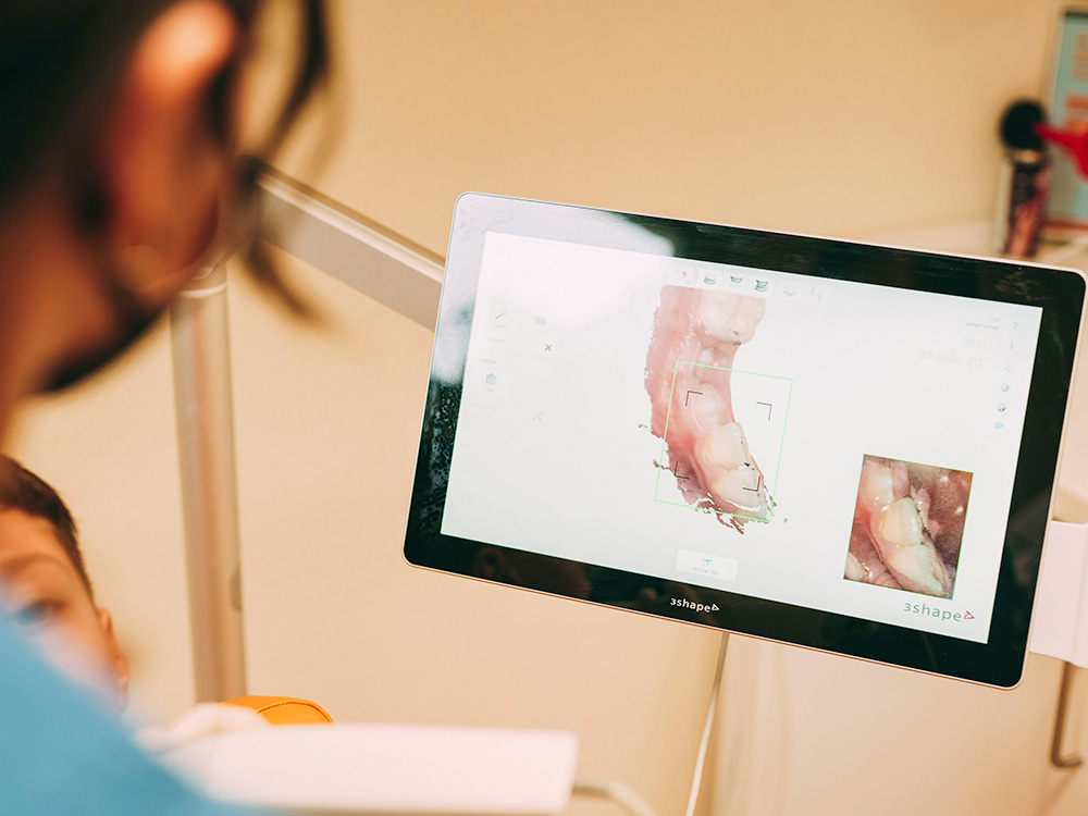 Der digitale Zahnabdruck bei docs & bears erfolgt mit einem 3-D-Scanner und ist angenehm, schmerz- sowie strahlungsfrei. Die Kamera erfasst Zähne und Kiefer präzise, das Ergebnis ist sofort am Bildschirm sichtbar. So werden Zahnspangen exakt und komfortabel angepasst
